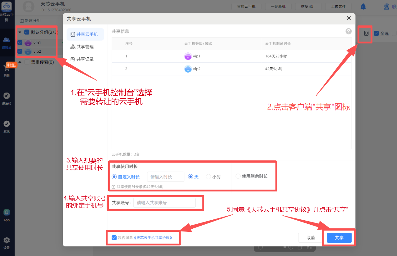 (3)输入想要的共享使用时长和共享账号(绑定的手机号),确认无误后勾选《天芯云手机共享协议》并点击“确认共享”。