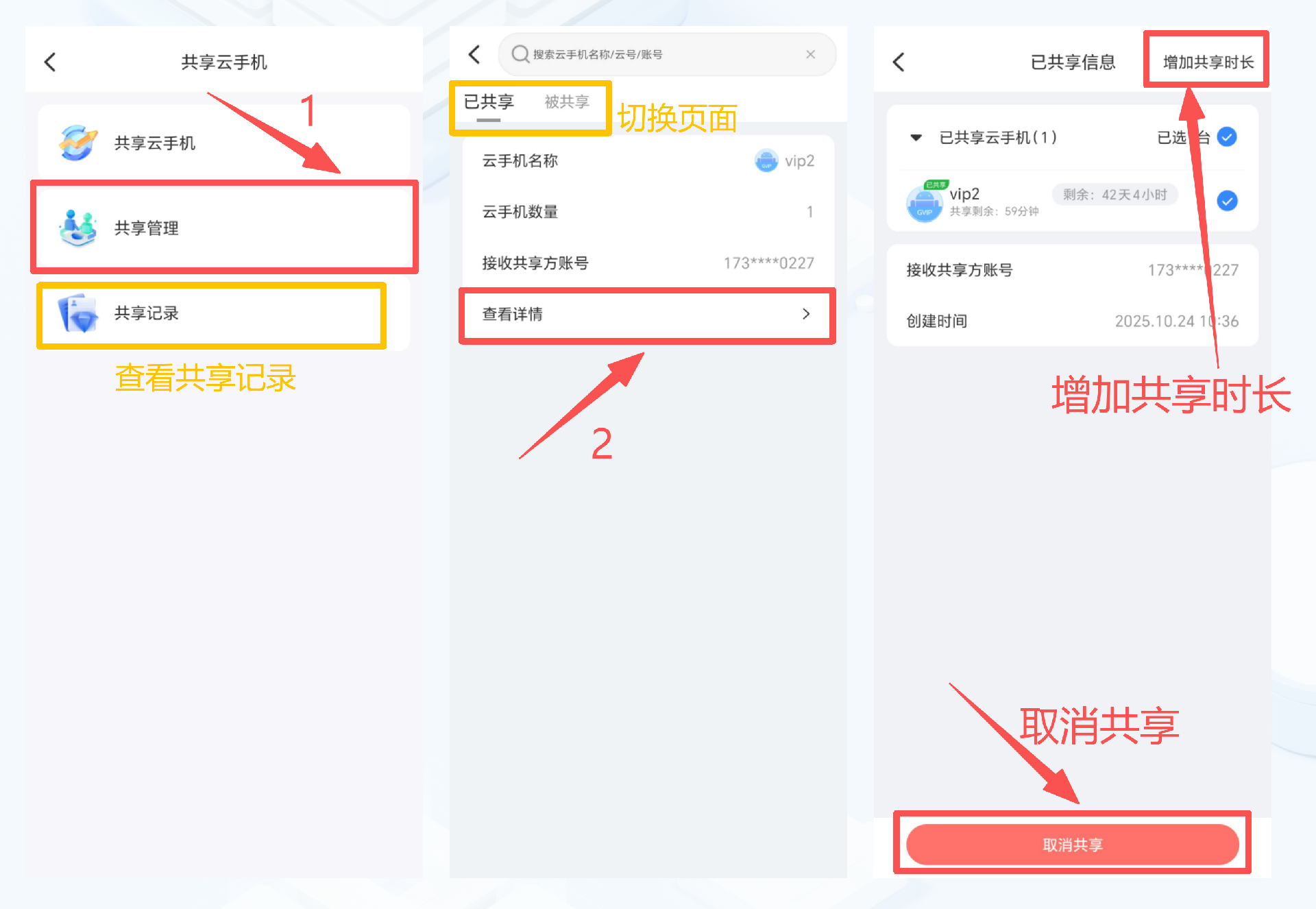 (2)找到已共享/被共享云手机的共享信息—点击“查看详情”。