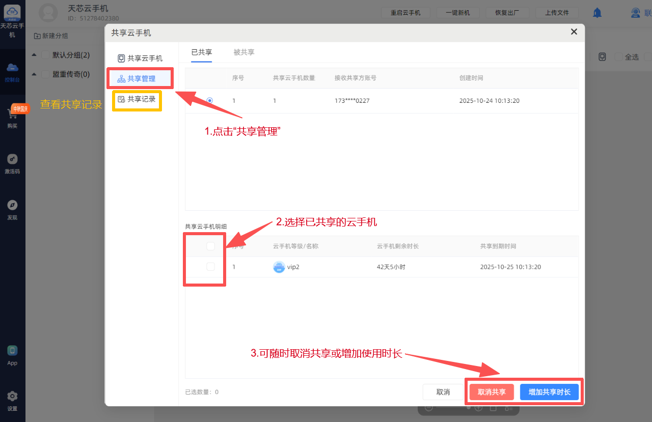 (3)选择想要进行操作的共享云手机,点击页面右上角“增加共享时长”或者页面底部“取消共享”进行相关操作。(仅授权方可增加共享时长)