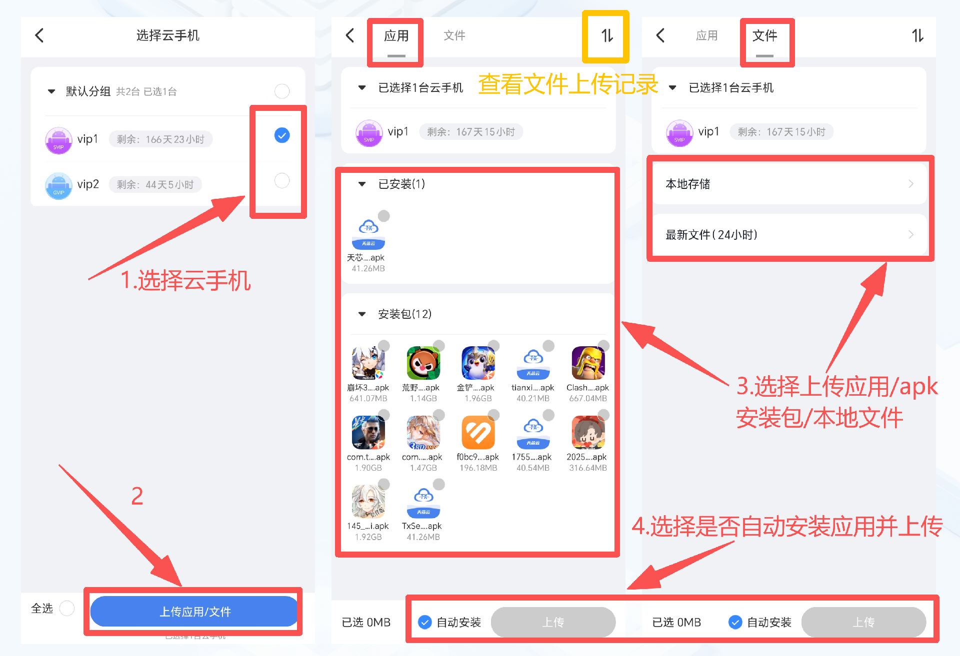 文件上传包含应用上传和本地文件上传:应用上传是指您可将您手机上所安装的应用及未安装的apk包上传到云手机内并可选择是否执行自动安装;本地文件上传是指您可将手机上的文件上传到云手机内使用。