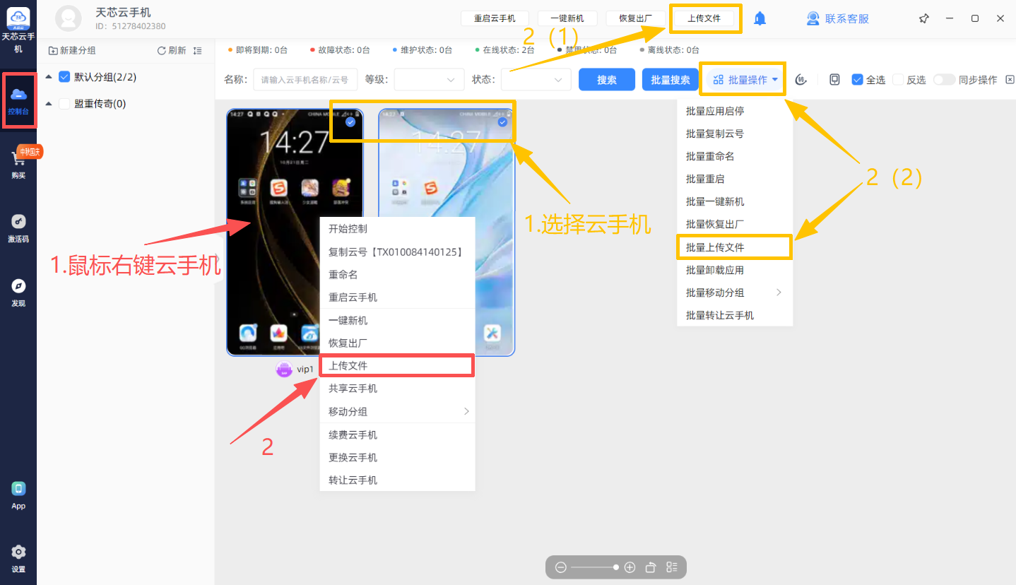 2.多台云手机进行文件上传:在“云手机”界面顶部栏点击“批量”—“文件上传”—选择云手机后即可进入文件上传页面