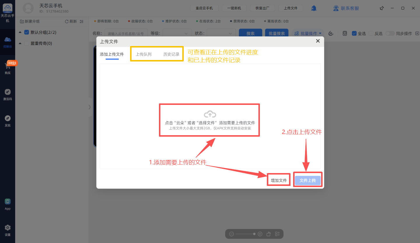 3.点击“云朵”或者“增加文件”添加需要上传的文件,添加完毕后点击“文件上传”将文件上传到所选云手机中。